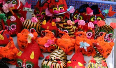 简介:布老虎是中国民间广为流传的一种玩具。在中国人心里,老虎是驱邪避灾、平安吉祥的象征,而且还能保护财富。农历五月初五端午节期间,民间盛行给儿童做布老虎,或者用雄黄在儿童的额头画虎脸,寓意健康、强壮、勇敢。布老虎的形式多种多样,有单头虎、双头虎、四头虎、子母虎、枕头虎、套虎等。制作布老虎的材料及工艺也各不相同,较常见的是把棉布、丝绸缝制成形,内部装填锯末或谷糠,表面用彩绘、刺绣、剪贴、挖补等手法描绘出虎